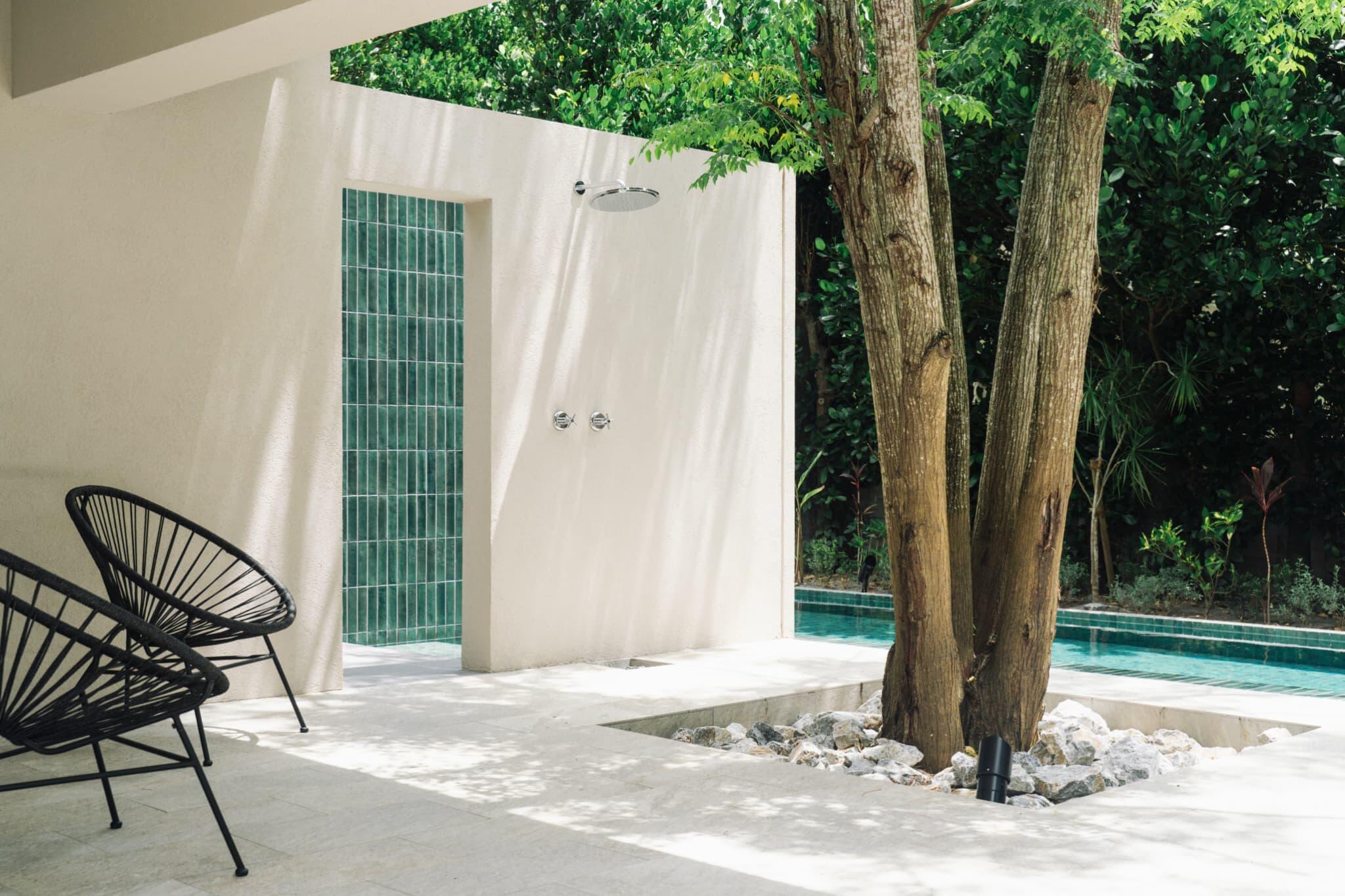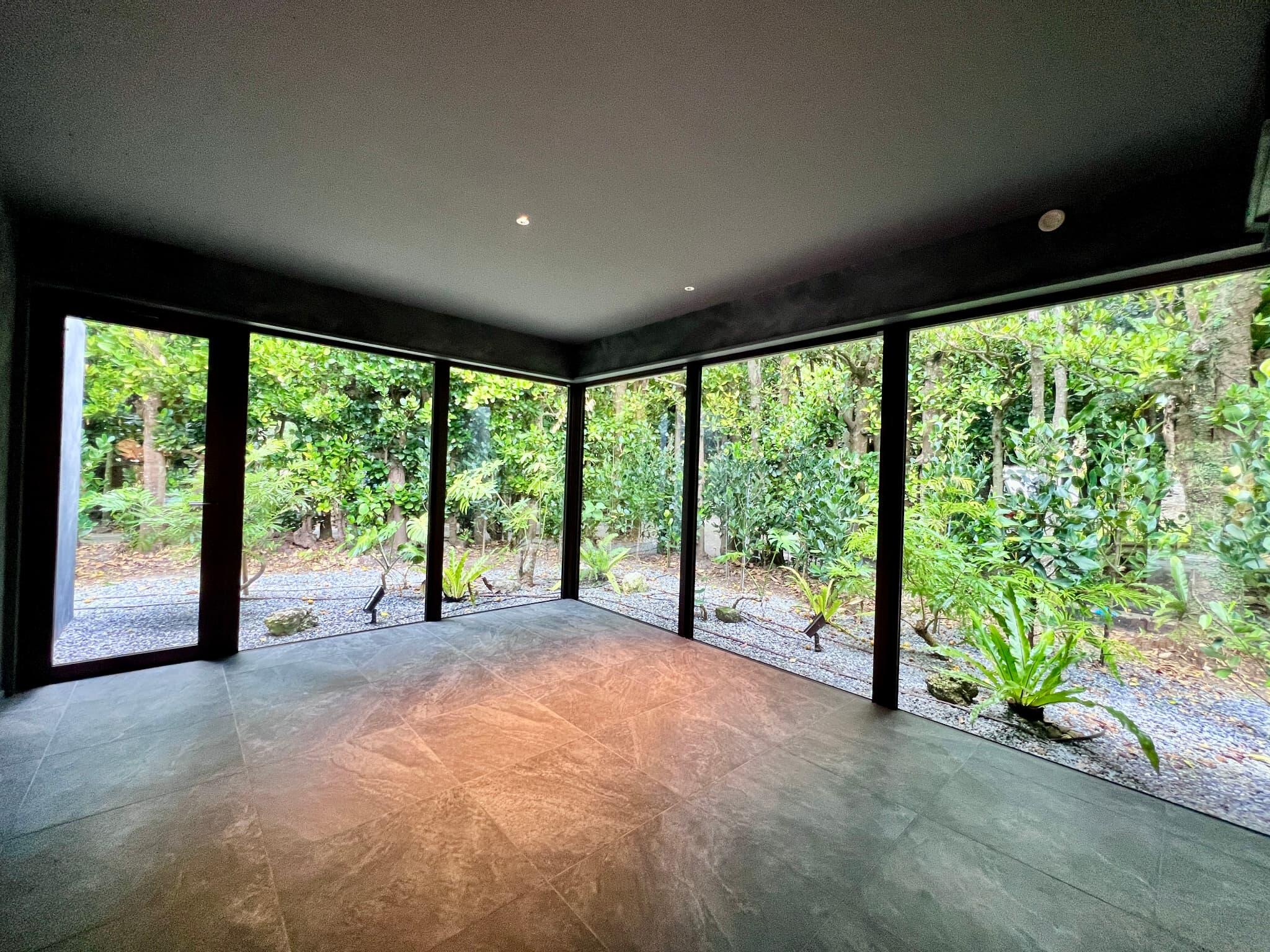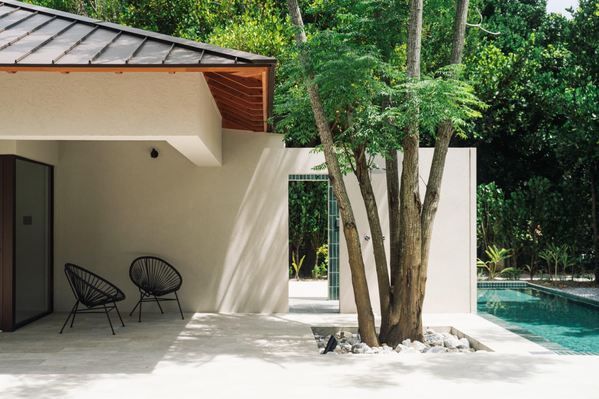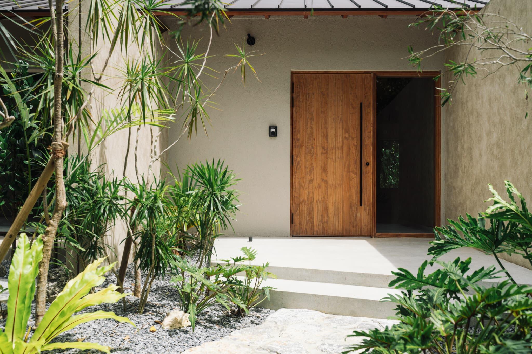 Exterior shaded by Okinawan Fukugi trees, known for their calming green canopies
